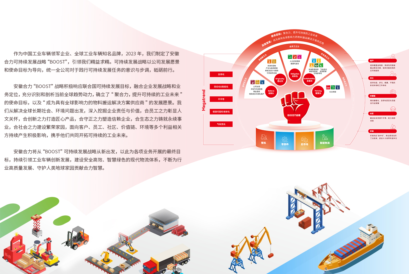 合力叉車(che)將秉持“世界五強 百年合力”的企業愿景,以“變革、創新、開放、合作(zuo)”為(wei)動力,致力于成為(wei)全球叉車(che)專家及中國自動化物流(liu)設備(bei)供應商。
